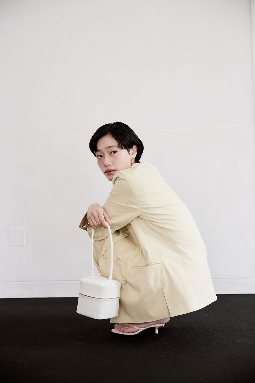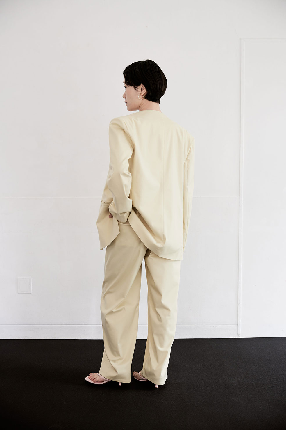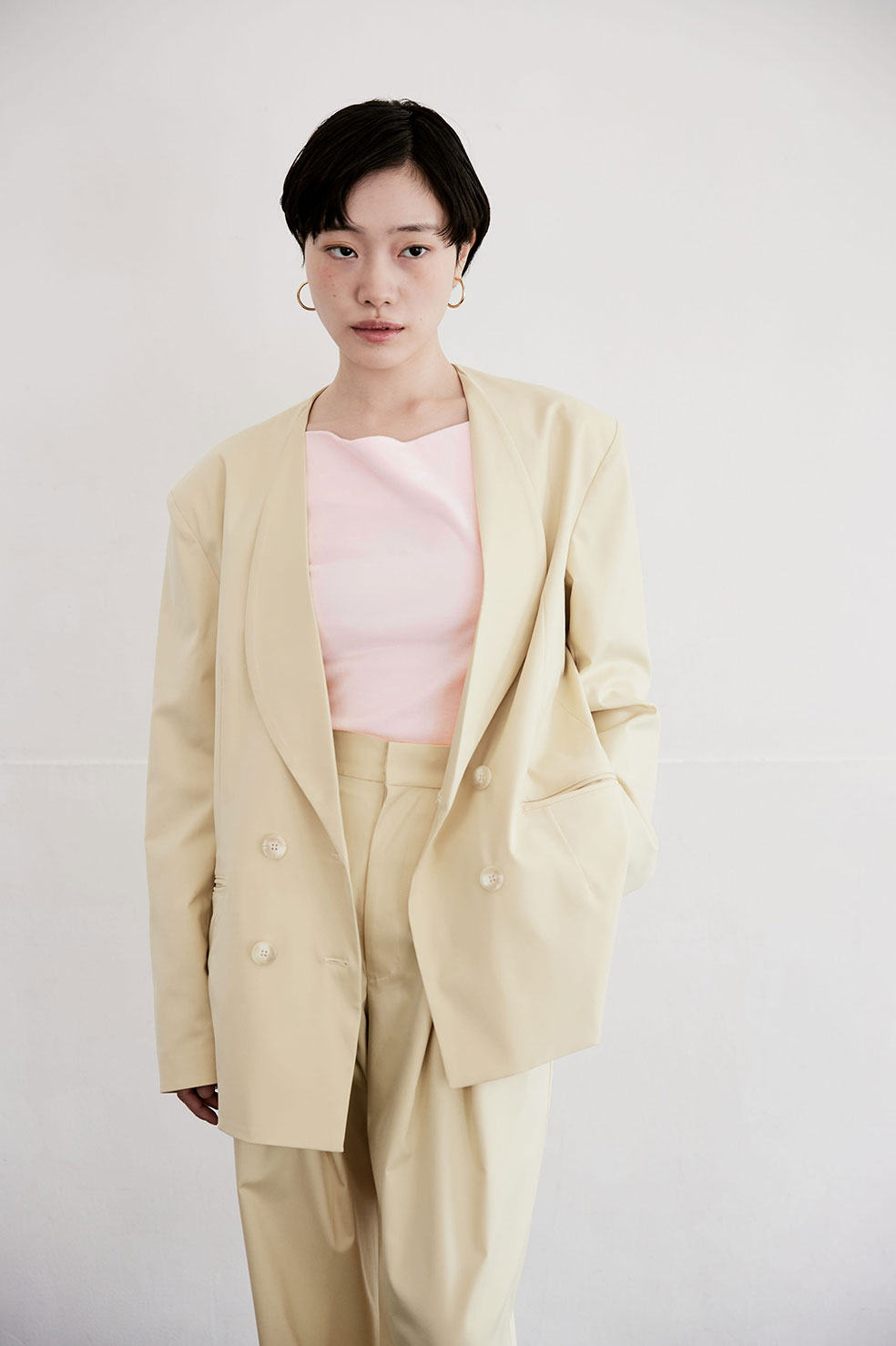 NECK DRAPE CAMI TOP (PINK) ¥13,000(¥14,300- tax in) DOUBLE TACK PANTS (CREAM) ¥20,000(¥22,000- tax in) SHAWL COLLAR JACKET (CREAM) ¥27,000(¥29,700- tax in) VANITY LEATHER BAG (WHT) ¥29,000(¥31,900- tax in)