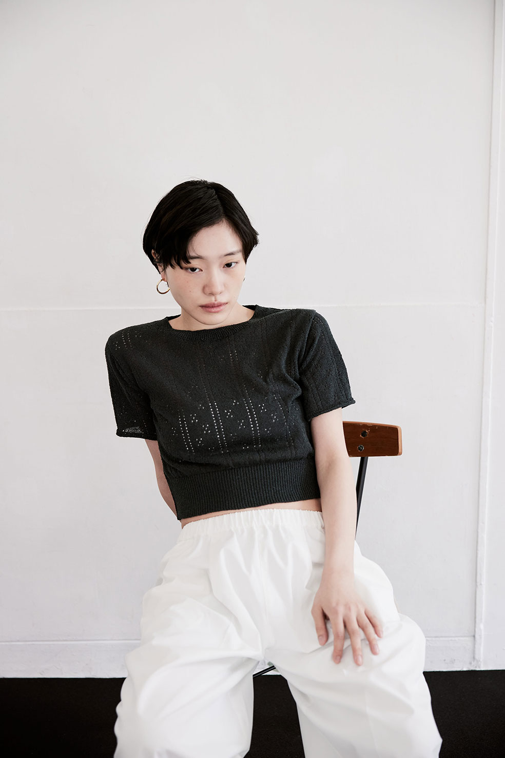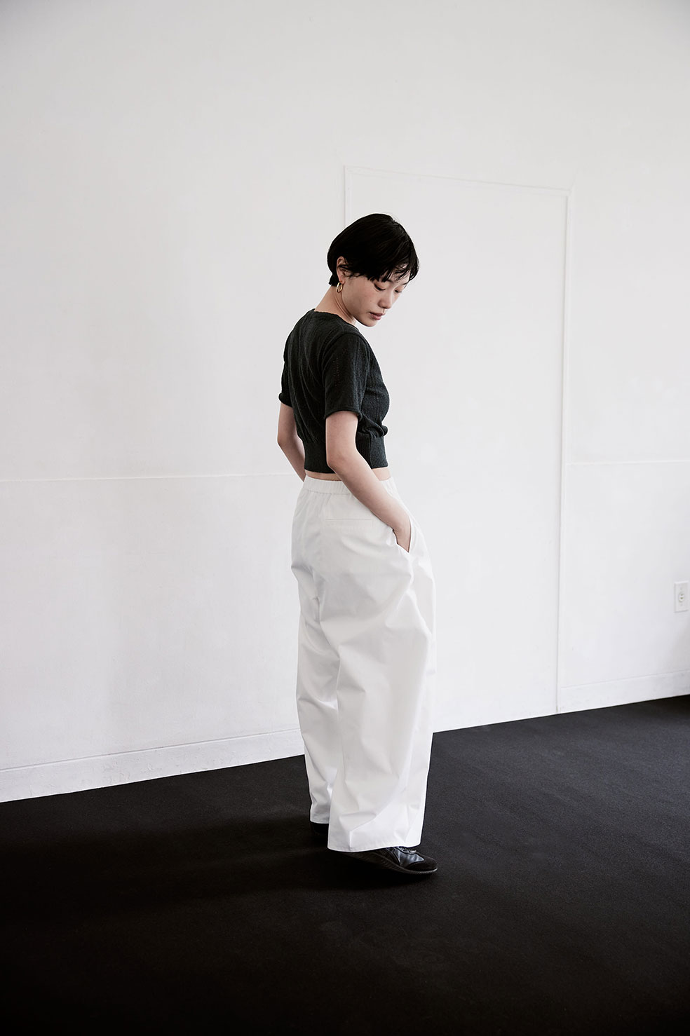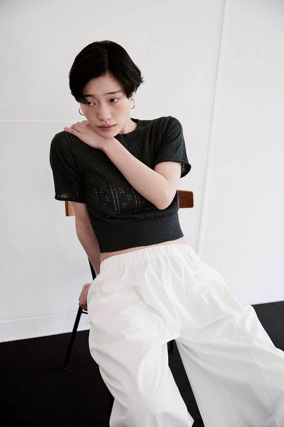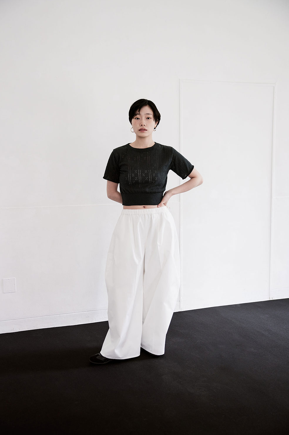 EYELET RIB KNIT TOP (CHARCOAL) ¥19,000(¥20,900- tax in) WIDE POINTED TROUSERS (WHT) ¥19,000(¥20,900- tax in)