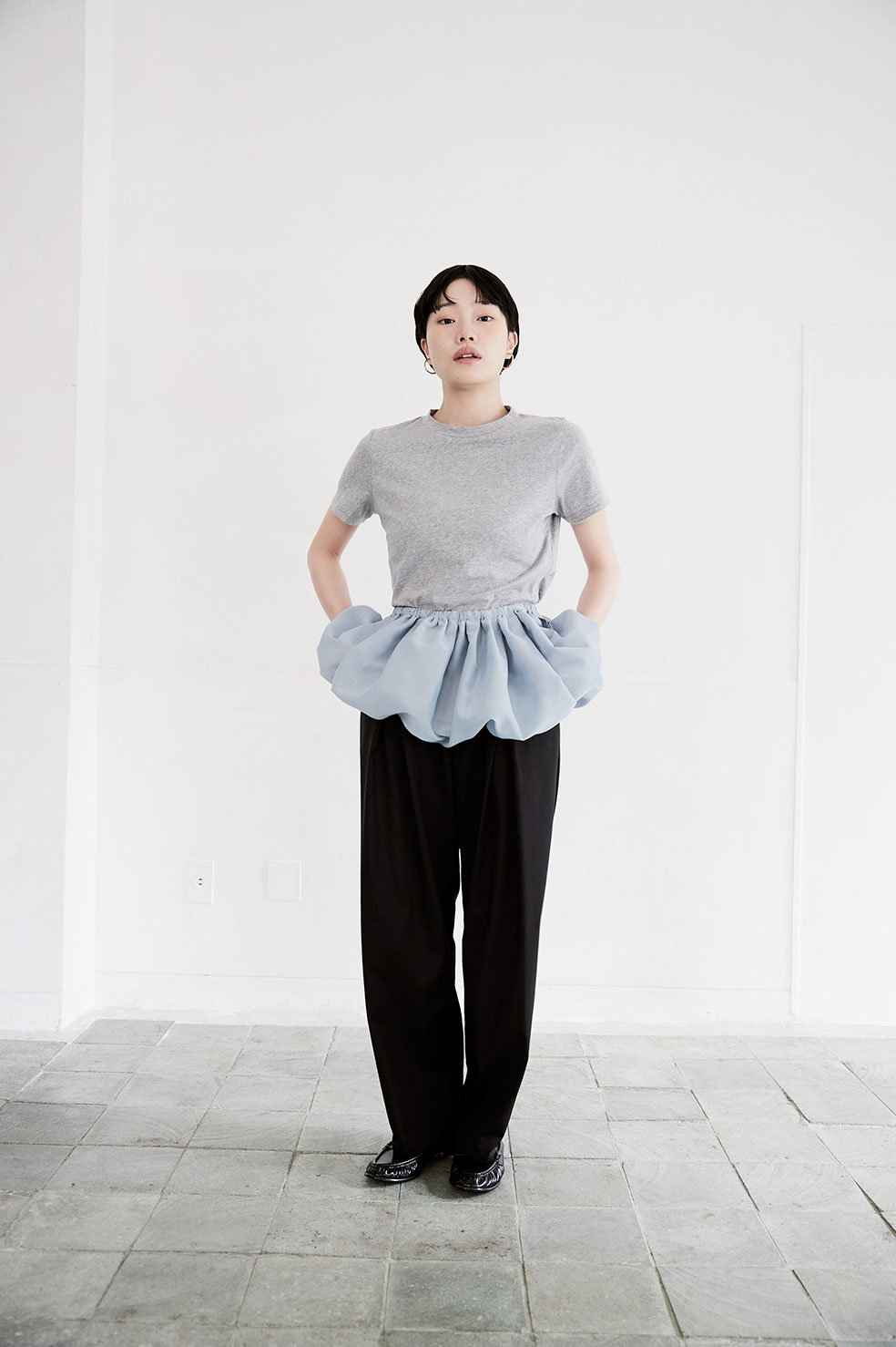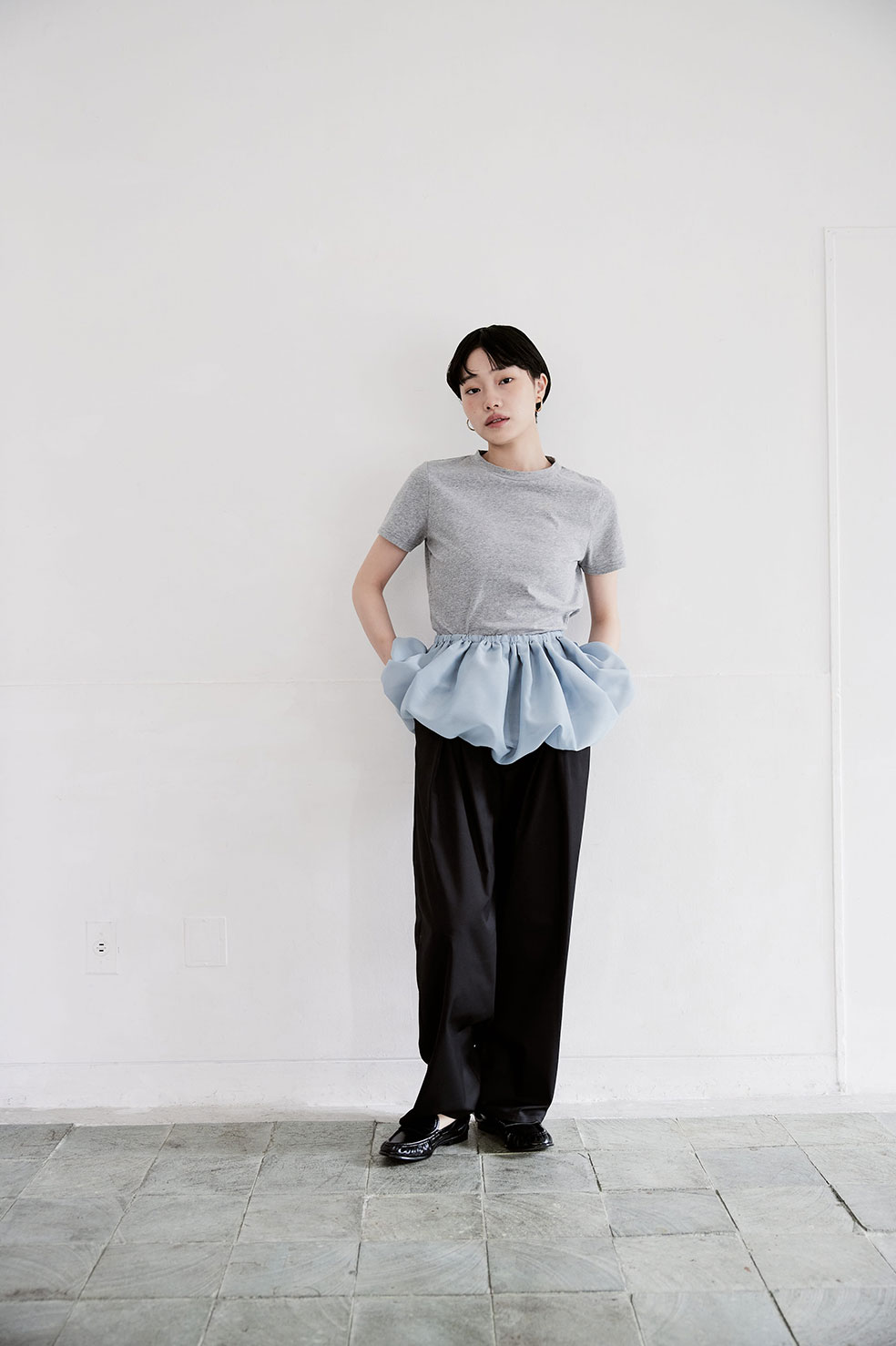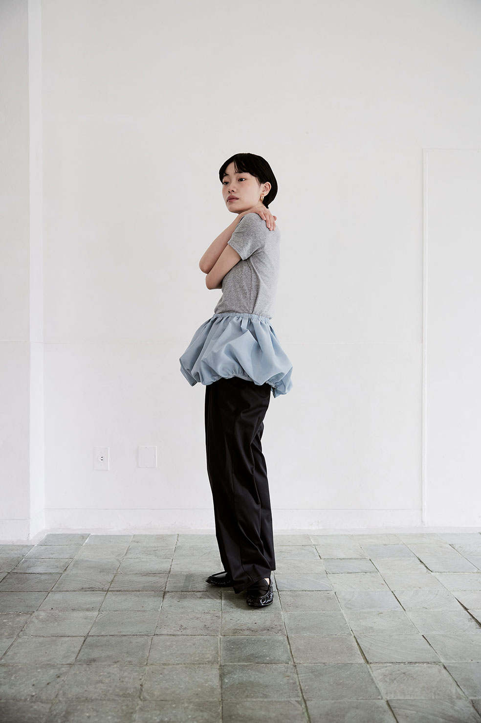 COMPACT TEE (GRY) ¥13,500(¥14,850- tax in) LAYERED BALLOON ITEM (BLUE GREEN) ¥16,800(¥18,480- tax in) DOUBLE TACK PANTS (BLK) ¥20,000(¥22,000- tax in)