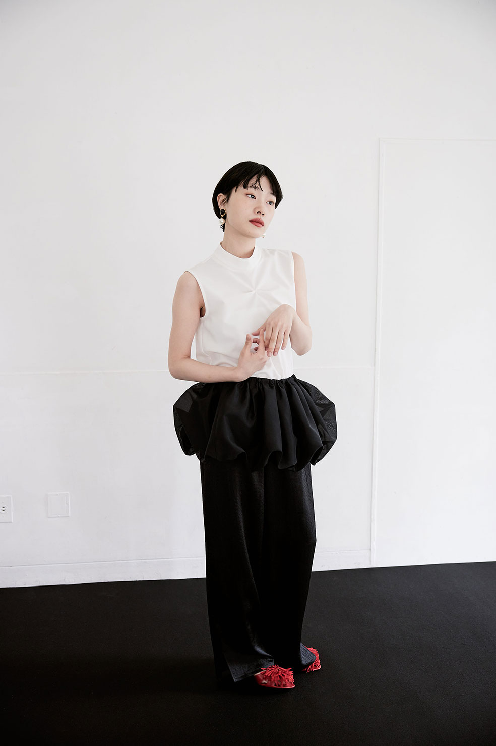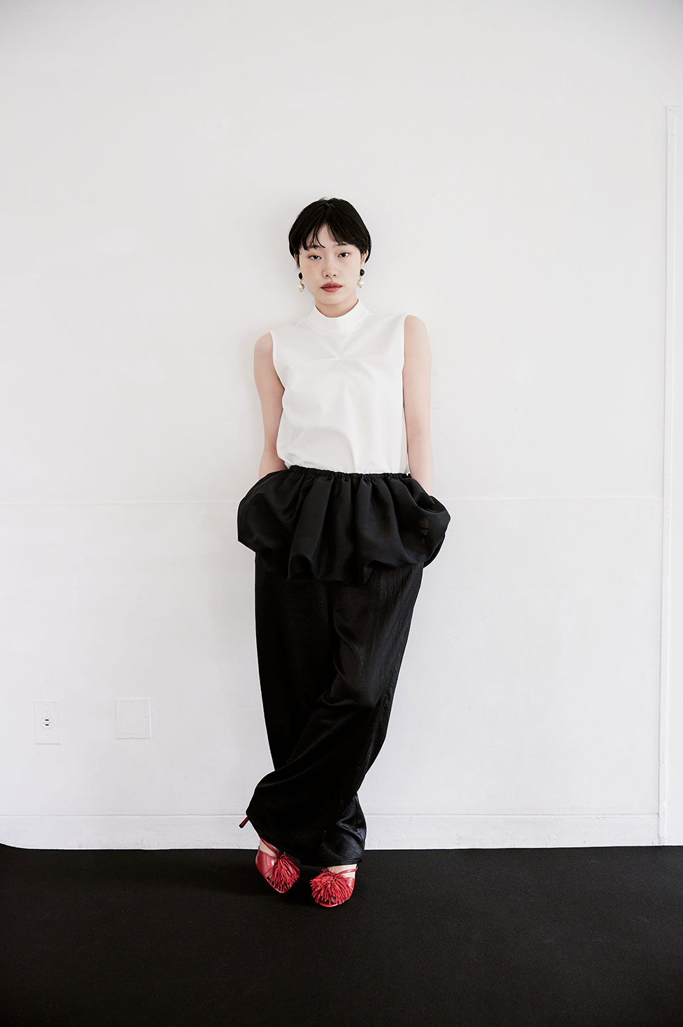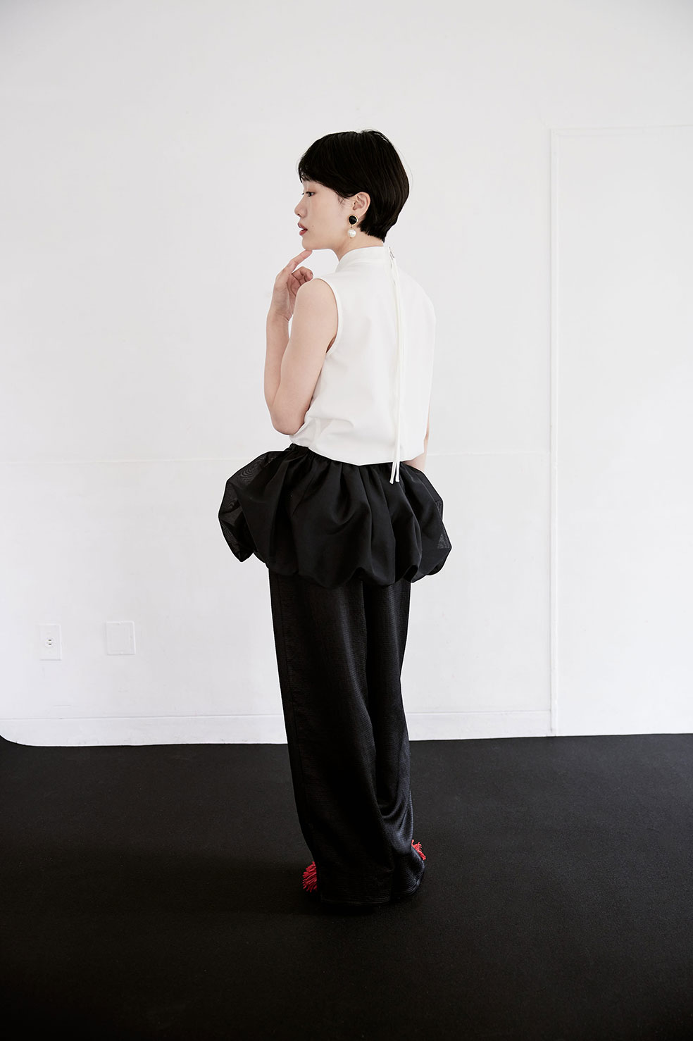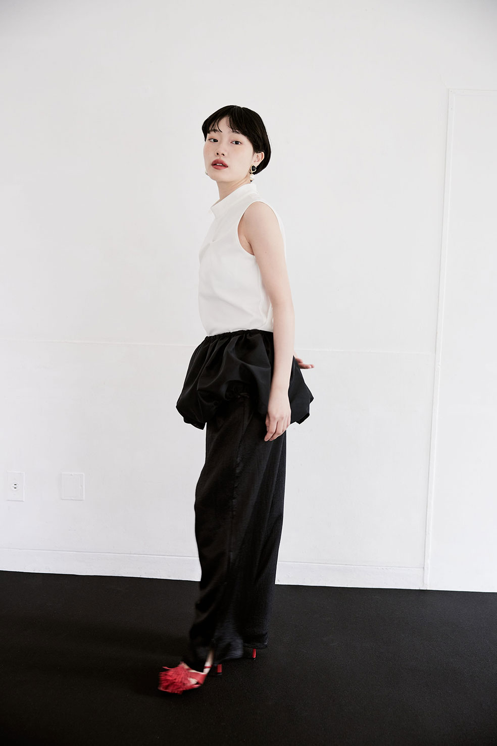 STAND COLLAR SLEEVELESS TOP (WHT) ¥17,900(¥19,690- tax in) SIDE SLIT PANTS (BLK) ¥18,900(¥20,790- tax in) LAYERED BALLOON ITEM (BLK) ¥16,800(¥18,480- tax in)